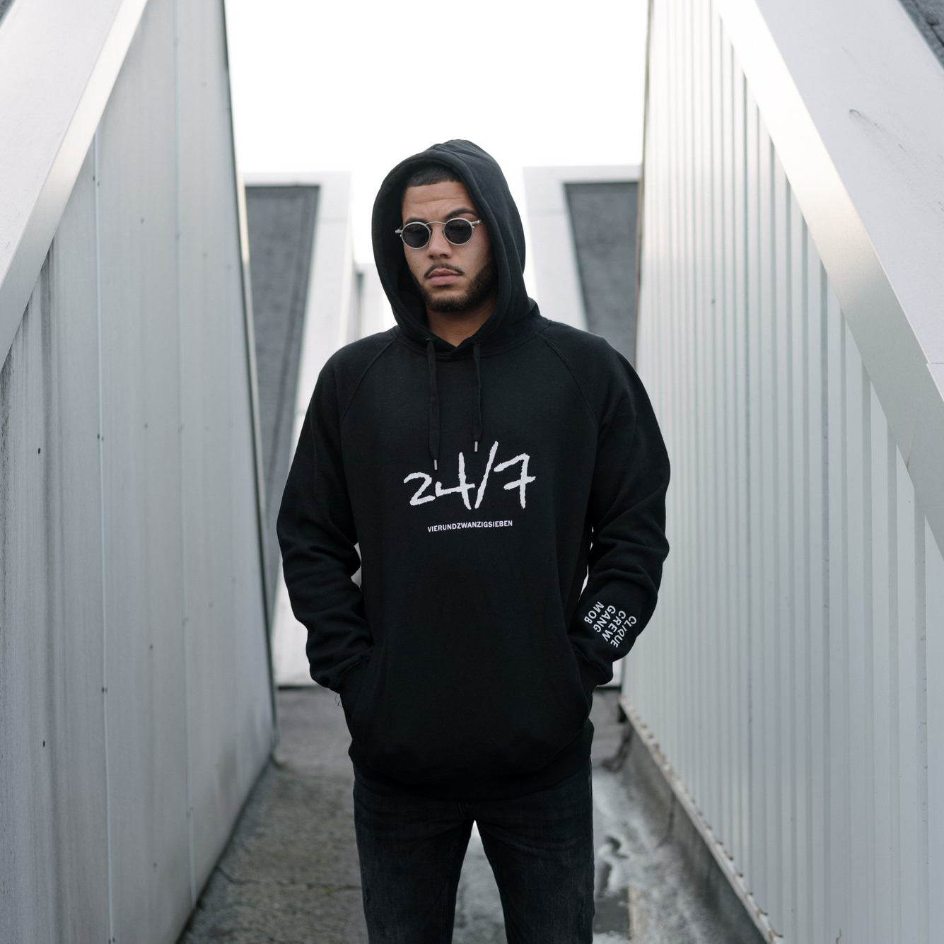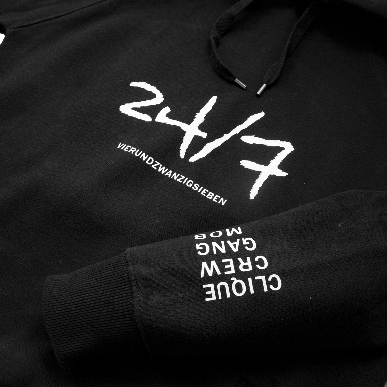 Schwarzer Hoodie mit "24/7 VIERUNDZWANZIGSIEBEN" Logo in weißem Siebdruck Print auf der Brust. Ein Ärmelprint ziert den linken Arm.