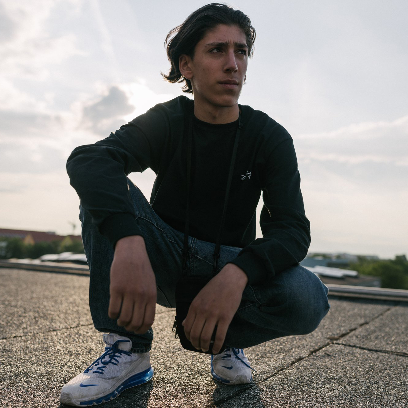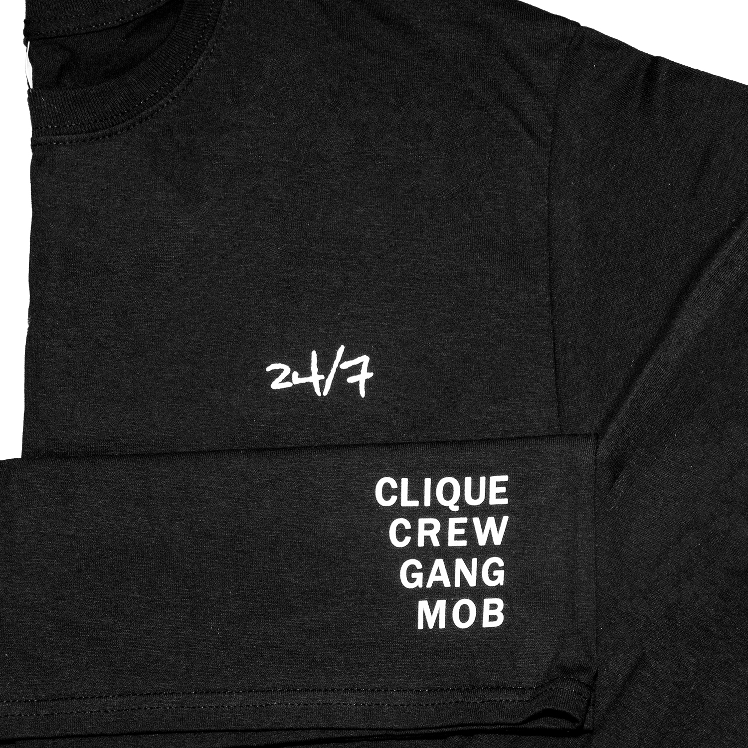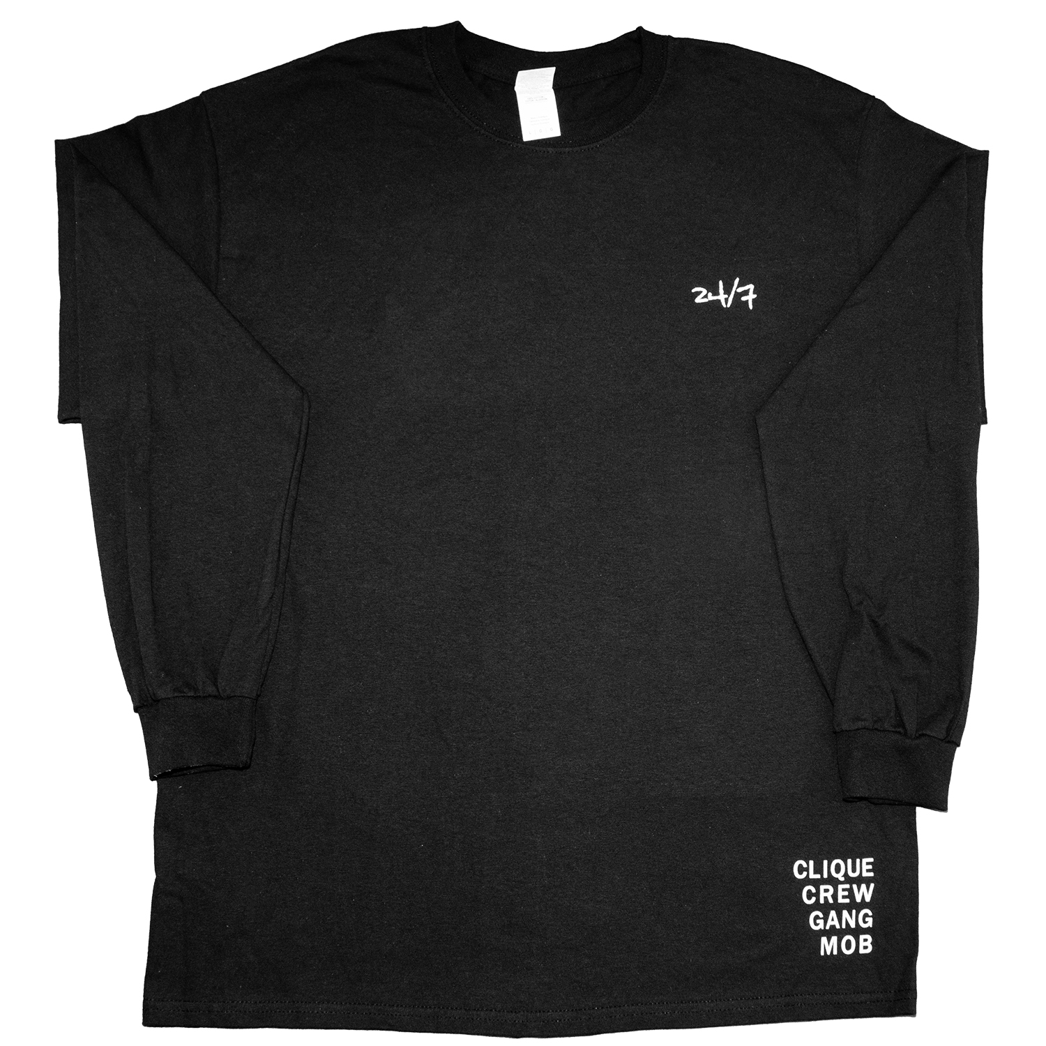 Schwarzes Baumwoll Longsleeve mit 24/7 Logo in weißem Siebdruck auf der linken Brustseite.
