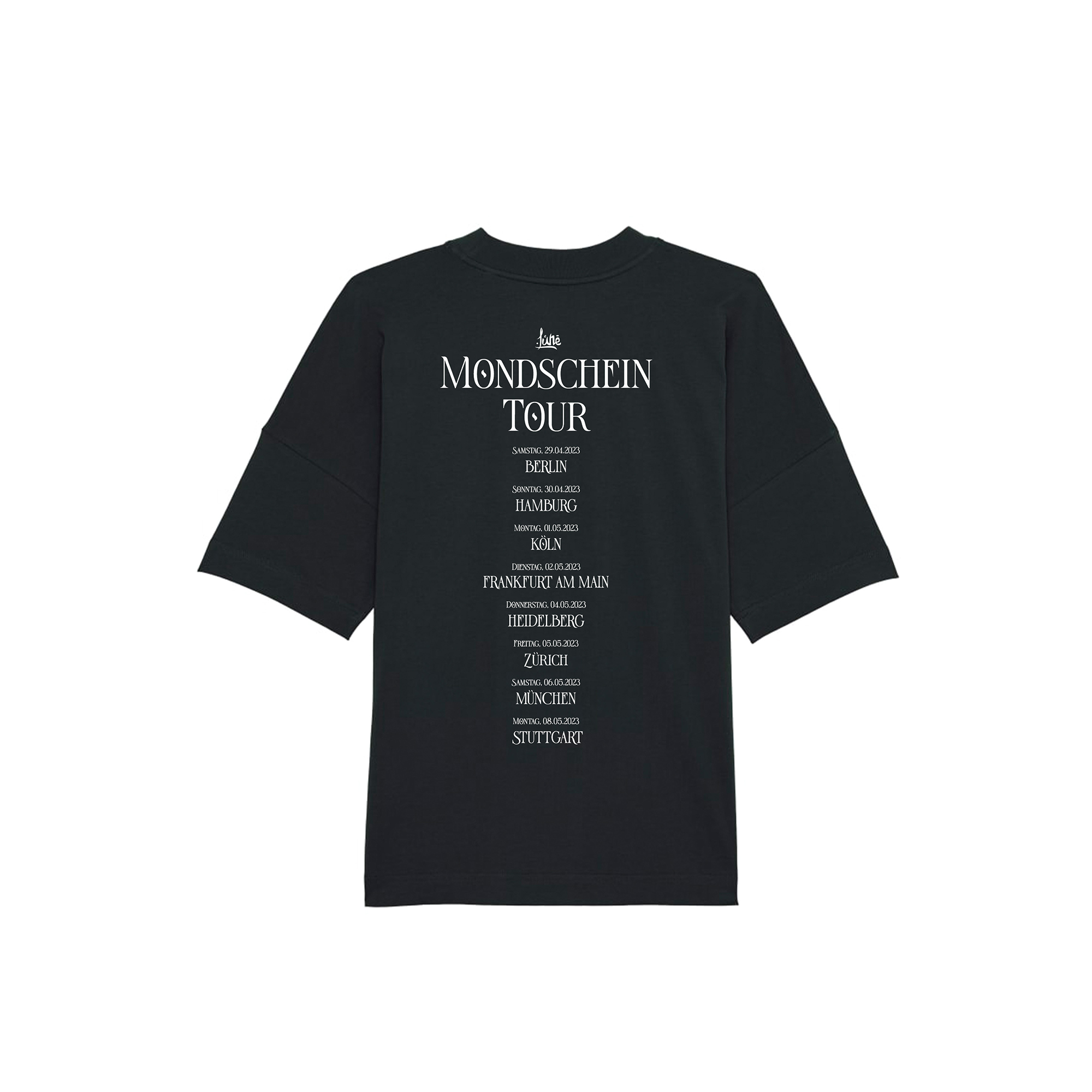 Schwarzes Oversize T-Shirt mit den Tour Daten aus dem Jahr 2023 in weißem Druck auf der Rückseite.
